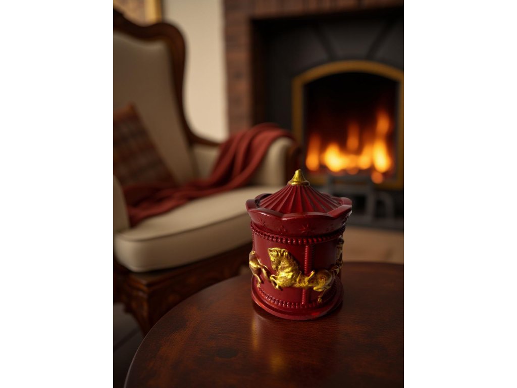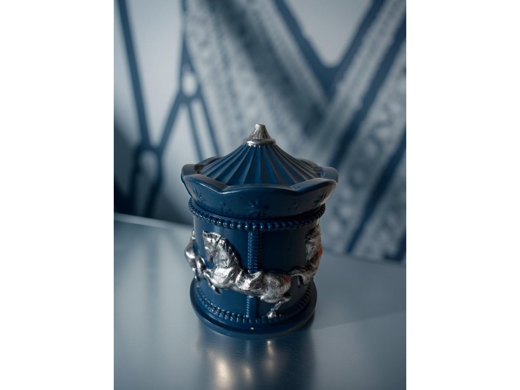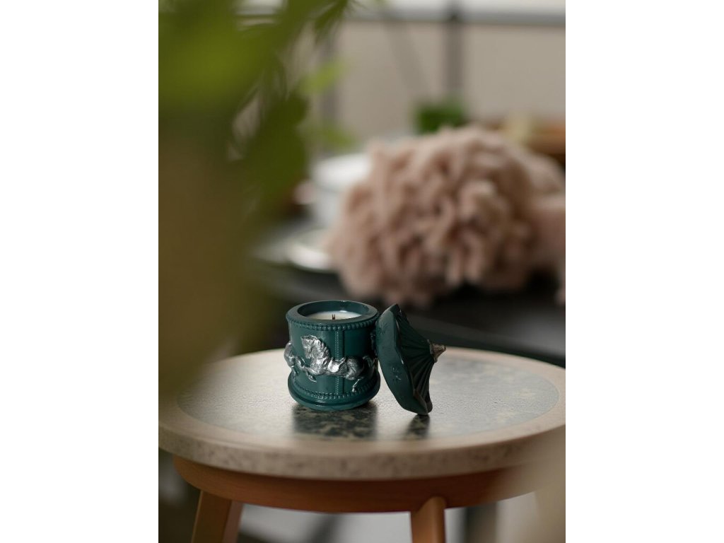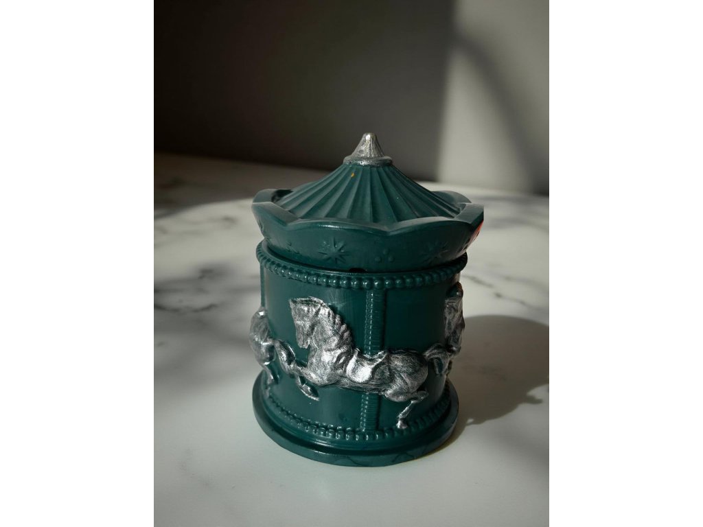 Každá nádoba je odlita z jesmonitu do tvaru kolotoče s koníky – malý nostalgický kousek, který v sobě nese kouzlo dětství. Uvnitř najdete přírodní sójový vosk s hravou vůní cukrové vaty a ovoce, která okamžitě probudí radostné vzpomínky.