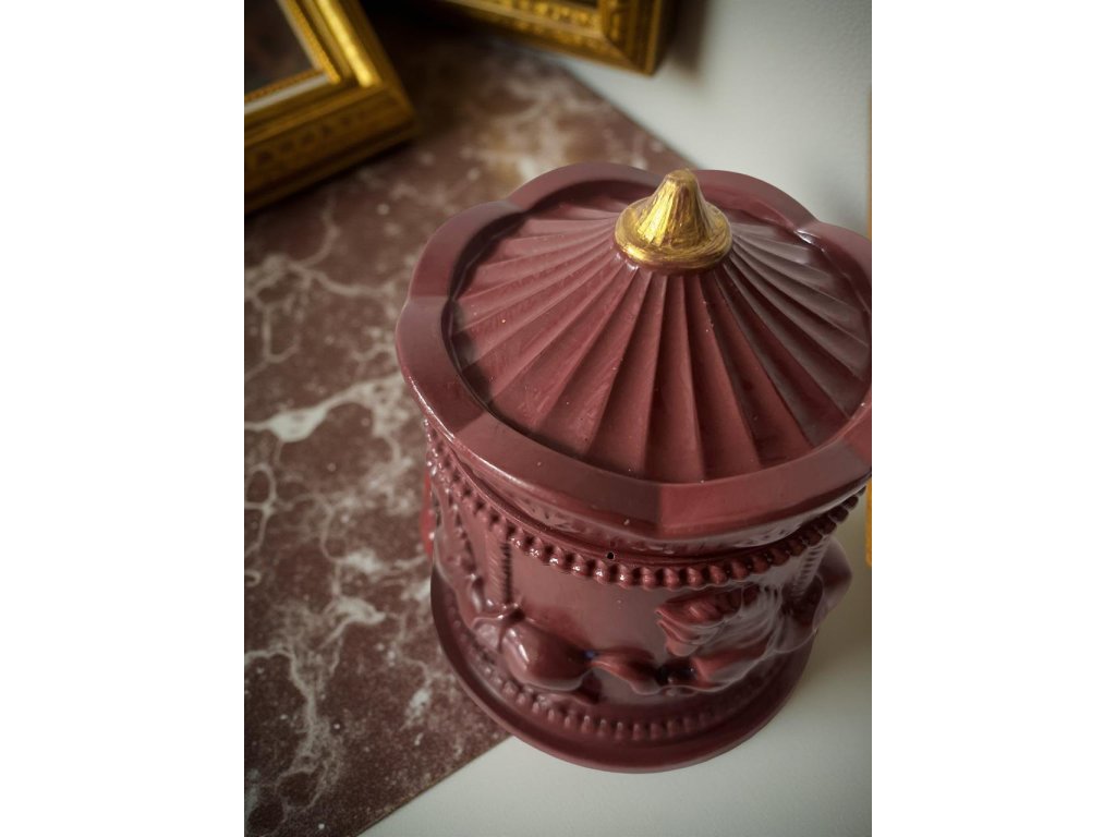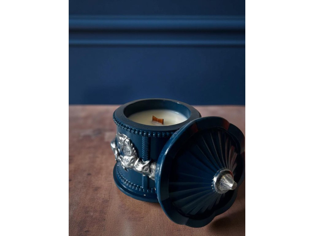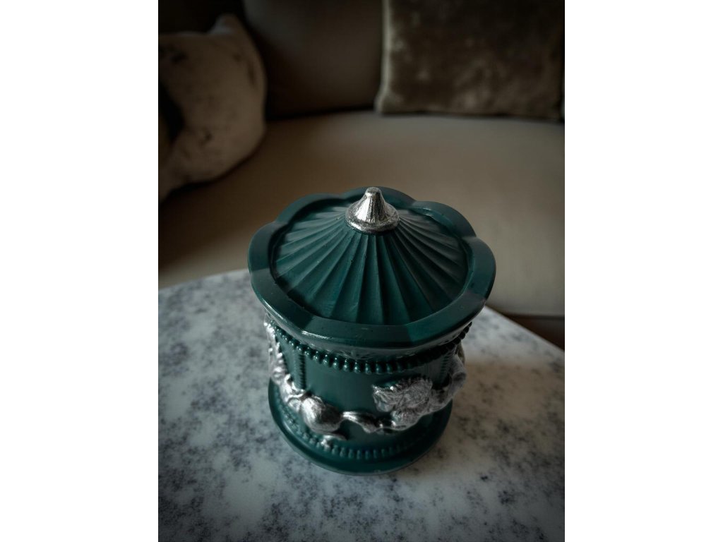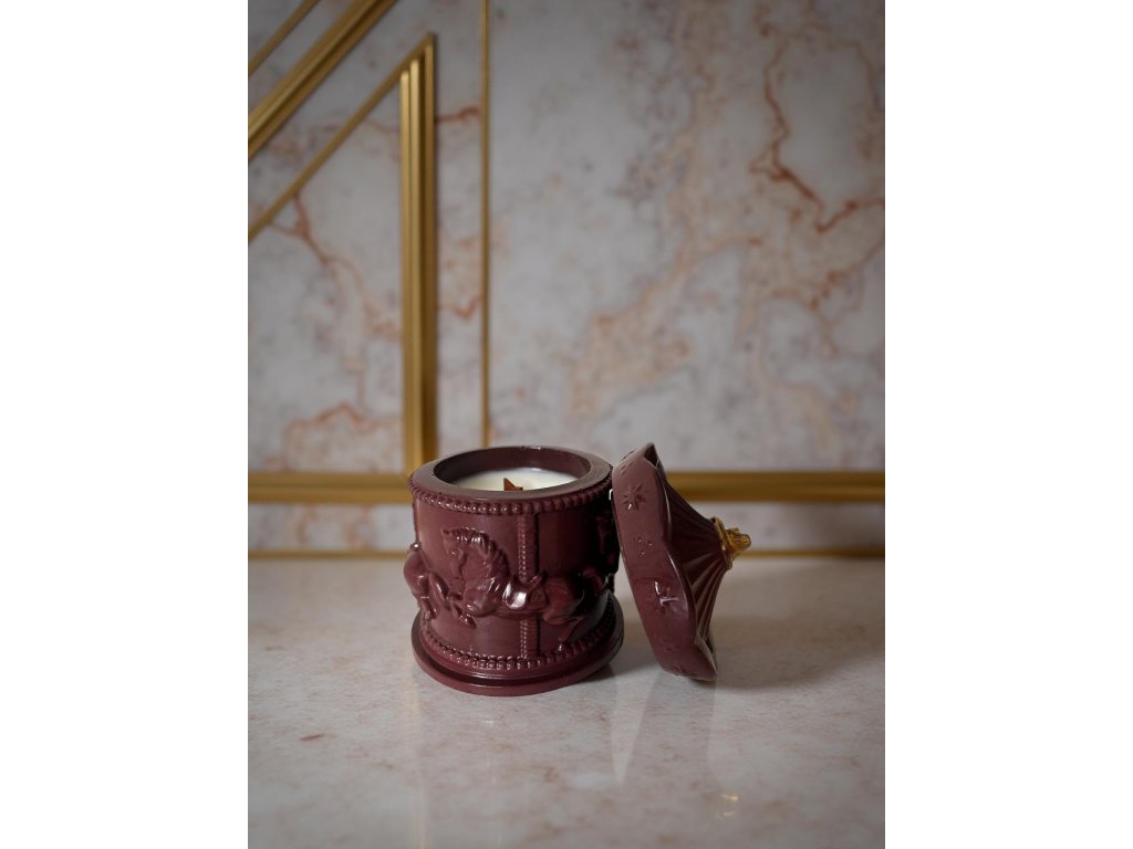 Každá nádoba je odlita z jesmonitu do tvaru kolotoče s koníky – malý nostalgický kousek, který v sobě nese kouzlo dětství. Uvnitř najdete přírodní sójový vosk s hravou vůní cukrové vaty a ovoce, která okamžitě probudí radostné vzpomínky.